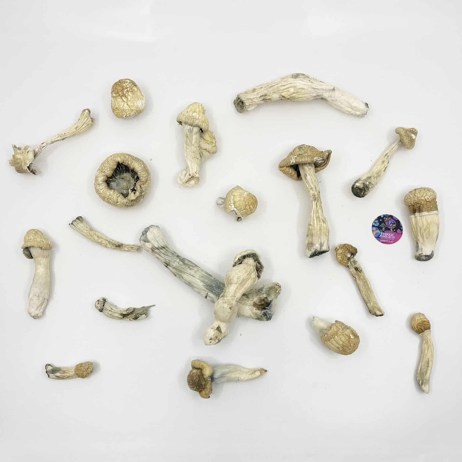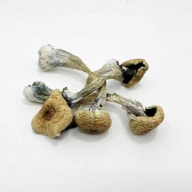 With broad white stems attached to large ivory coloured caps. This strain frequently bruises a deep azure blue which indicates elevated levels of psychotropic alkaloids that these magic mushrooms contain.